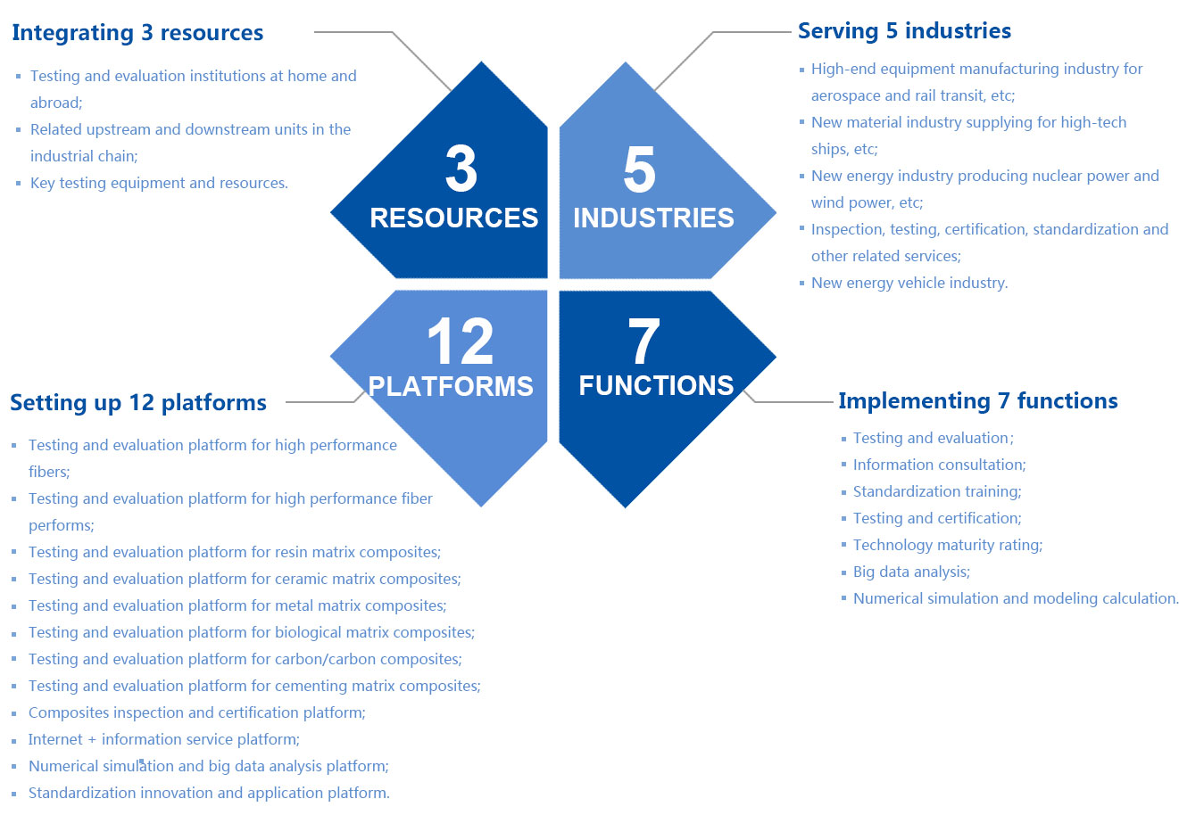 Composites Industry Center, a part of National New Materials Testing and Evaluation Platform, is a national comprehensive service platform providing testing, evaluation, certification, standardization, consultation, big data services and other capabilities for the whole process of research, development, production and application of composite materials in China. It belongs to the key platform on new materials of Ministry of Industry and Information Technology of China. Led by Nanjing Fiberglass Research and Design Institute Co., Ltd., the Center integrates 3 major resources, serves 5 major industries, implements 7 functions and sets up 12 major platforms in an effort to solve the harsh situation of " Existing materials are not easy to use while promising materials are doubted for use" in the new material system of the country.