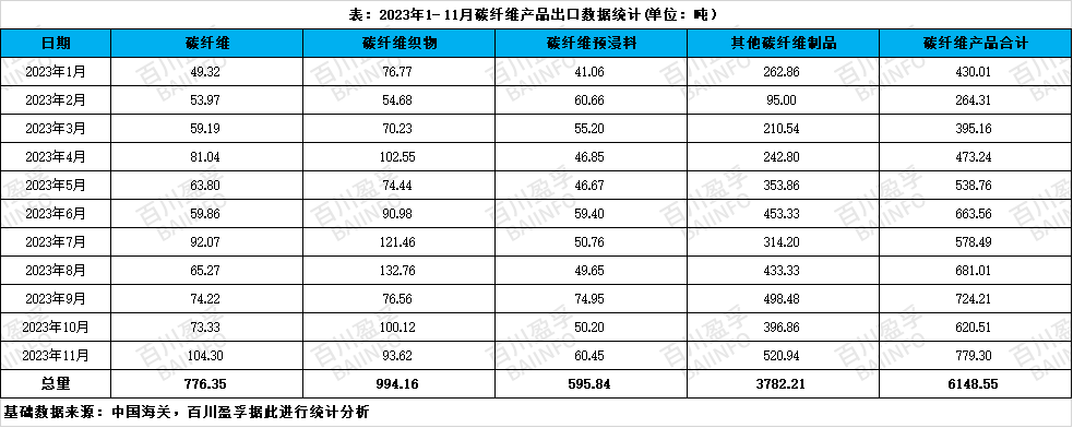 据海关数据统计,2023年11月我国进口碳纤维514.93吨,进口碳纤维织物52.36吨,进口碳纤维预浸料157.64吨,进口其他碳纤维制品399.91吨,进口碳纤维产品合计1124.83吨。2023年11月我国出口碳纤维104.30吨,出口碳纤维织物93.62吨,出口碳纤维预浸料60.45吨,出口其他碳纤维制品520...