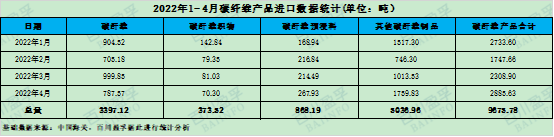 据海关数据统计,2022年4月我国进口碳纤维787.57吨,进口碳纤维织物70.30吨,进口碳纤维预浸料267.93吨,进口其他碳纤维制品1759.83吨,进口碳纤维产品合计2885.63吨。2022年1-4月我国累计进口碳纤维3397.12吨,进口碳纤维织物373.52吨,进口碳纤维预浸料868.19吨,进口其他碳纤...