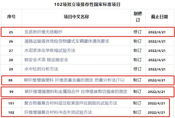 日前,《关于征求〈气体分析 动态法制备校准用混合气体 第1部分:通用要求〉等102项拟立项推荐性国家标准项目意见的通知》正式发布。其中,涉及《玄武岩纤维无捻粗纱》、《碳纤维增强塑料 纤维质量含量的测定 热重分析法(TG)》、《碳纤维增强塑料和金属组合件 拉伸搭接剪切强度的测定》、《聚合物基复合材料层压板紧固件拉脱阻抗试...