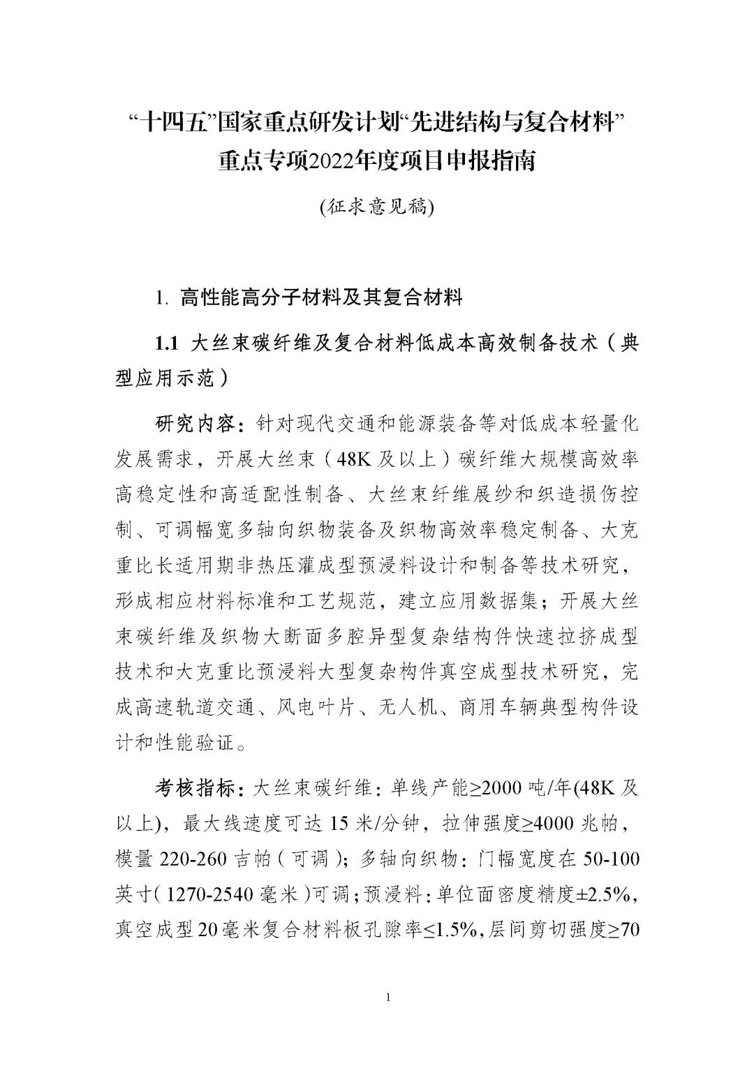 近期,国家科技管理信息系统公共服务平台公布了44个国家重点研发计划重点专项2022年度项目申报指南征求意见稿,其中包含《“十四五”国家重点研发计划“先进结构与复合材料”重点专项2022年度项目申报指南(征求意见稿)》。其中,大丝束碳纤维及复合材料低成本高效制备技术(典型应用示范)在列: