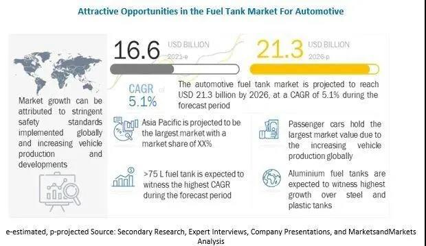根据Markets and Markets网站发布的最新市场分析报告,2021年的汽车燃料储罐市场规模估计为166亿美元,预计到2026年,该市场规模将增长到213亿美元,预测期内年复合增长率为5.1%。需求不断增长、车辆产量增加、快速城市化以及开发具有更高燃油效率、和更长行驶里程轻型汽车的投资不断增加等因素,预计将推...
