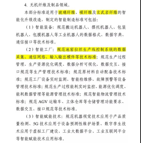 近日,工业和信息化部办公厅印发《建材行业智能制造标准体系建设指南(2021版)》(以下简称《指南》)。其中,涉及玻璃纤维、碳纤维及玄武岩纤维的智能化升级改造适用标准,《指南》也提出了规范池窑拉丝生产线控制系统的数据采集、通信网络、输入输出模件等技术标准的要求。以下为通知原文: