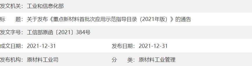 关于发布《重点新材料首批次应用示范指导目录(2021年版)》的通告工信部原函〔2021〕384号为进一步做好重点新材料首批次应用保险补偿试点工作,现发布《重点新材料首批次应用示范指导目录(2021年版)》,自2022年1月1日起施行。《重点新材料首批次应用示范指导目录(2019年版)》(工信部原〔2019〕254号)同...