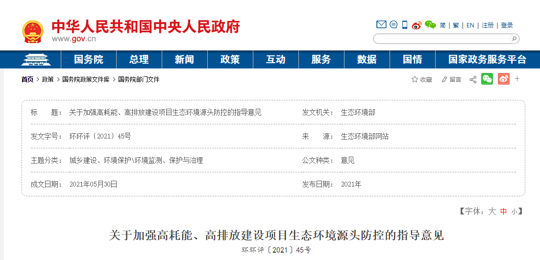 为全面落实党的十九届五中全会关于加快推动绿色低碳发展的决策部署,坚决遏制高耗能、高排放项目盲目发展,推动绿色转型和高质量发展,生态环境部于2021年6月1日发布了《关于加强高耗能、高排放建设项目源头防控的指导意见》。《意见》中明确指出,将碳排放影响评价纳入环境影响评价体系。各级生态环境部门和行政审批部门应积极推进“两高...