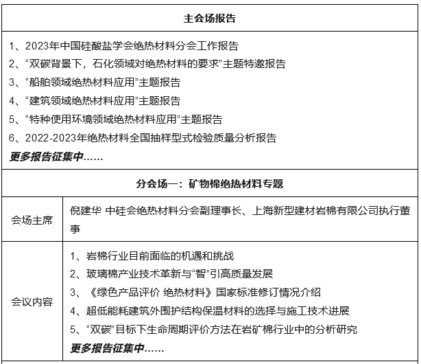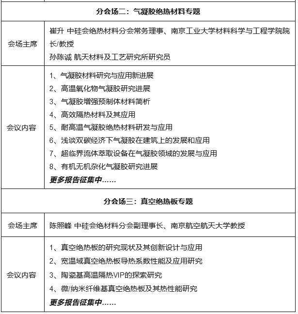 本届年会内容丰富,同期将进行:“中国硅酸盐学会绝热材料分会第二届理事单位”授牌仪式和“全国绝热材料产品质量稳定合格企业”颁奖仪式;“矿物棉绝热材料专题”“气凝胶绝热材料专题”“真空绝热板专题”分会场;《绿色产品评价 绝热材料》国家标准工作组闭门会议及《气凝胶复合绝热材料用基材 第2部分:玻璃纤维湿法毡》标准启动会;“绝热材料应用与产业发展成果展示会”。