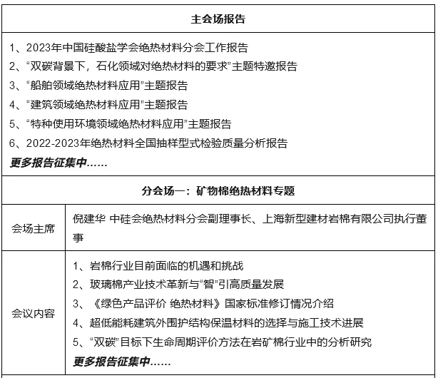 本届年会内容丰富,同期将进行:“中国硅酸盐学会绝热材料分会第二届理事单位”授牌仪式和“全国绝热材料产品质量稳定合格企业”颁奖仪式;“矿物棉绝热材料专题”“气凝胶绝热材料专题”“真空绝热板专题”分会场;《绿色产品评价 绝热材料》国家标准工作组闭门会议及《气凝胶复合绝热材料用基材 第2部分:玻璃纤维湿法毡》标准启动会;“绝热材料应用与产业发展成果展示会”。