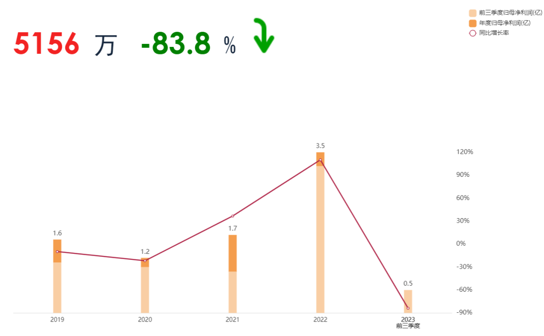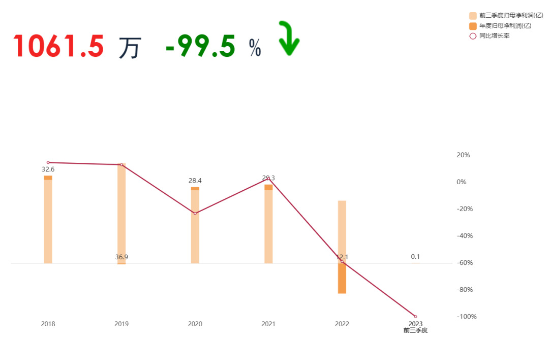金隅集团10月28日发布三季度业绩公告称,2023年前三季度营收约725.95亿元,同比减少8.77%;归属于上市公司股东的净利润约1061万元,同比减少99.54%。其中三季度实现营业总收入234.59亿元,同比下降4.42%,环比下降8.56%;归母净利润-3.99亿元,同比下降180.90%,环比下降153.85%;扣非净利润-4.63亿元,同比下降197.52%,环比下降1372.40%。