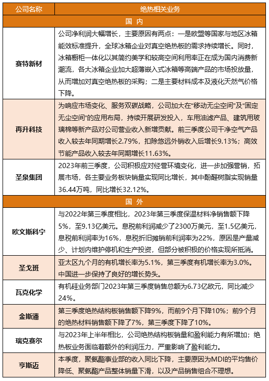 表2 全球绝热材料上市企业(部分)2023年前三季度绝热相关业务
