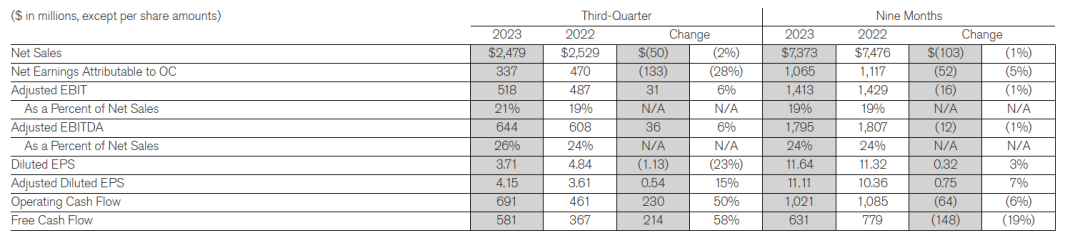 欧文斯科宁:2023年前三季度实现净销售额73.73亿美元