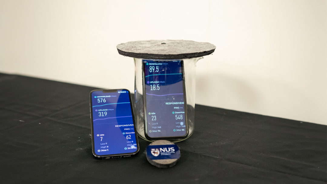 在这项演示中,被灰色气凝胶屏蔽的手机的WiFi速度明显较慢,表明手机接收到的电磁波信号较弱。